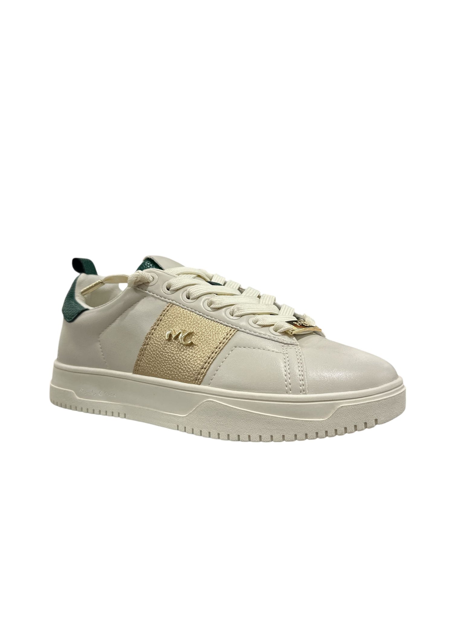 Sneakers donna basse in ecopelle bianca, inserto sul tallone Verdone , lacci in tessuto bianco,